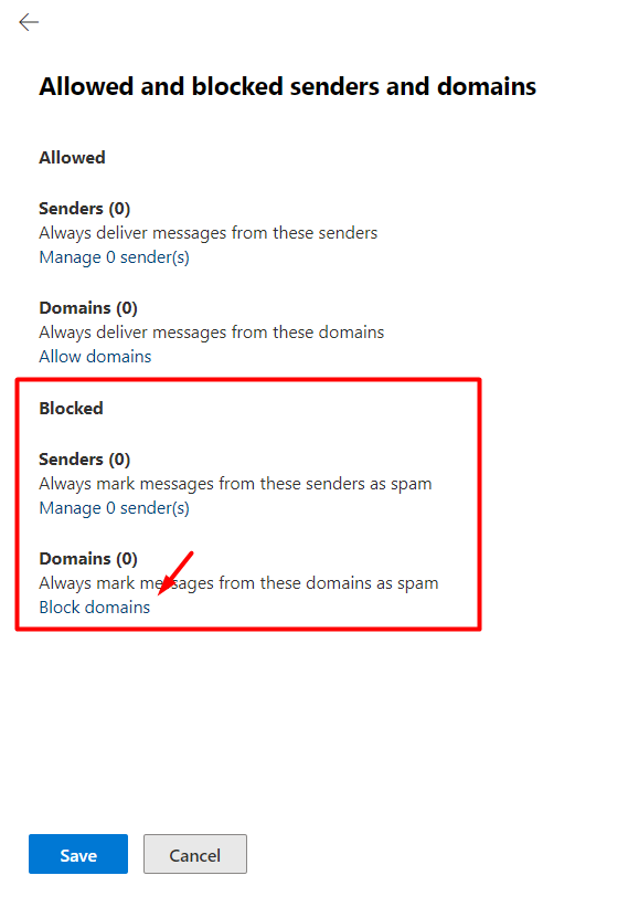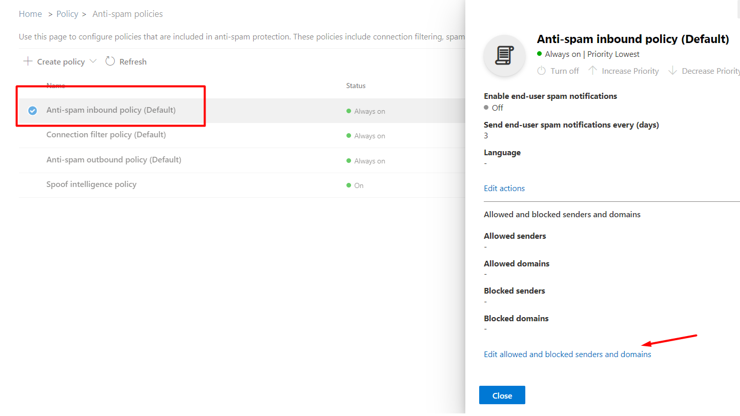 Anti-spam policies başlığında Default politikalar arasında Anti-spam inbound policy yer almakta. Bu politikaya tıkladığınızda ekranın sağında bir pencere açılacaktır. Edit allowed and blocked senders and domains seçeneğine tıklayın.
