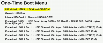 ILO ekranında soldaki Remote Console & Media seçeneğine tıklanır ve .NET Remote Console ile server konsoluna erişilir. Açılan konsol ekranda Virtual Drives başlığına tıklanarak Local bilgisayardaki SPP (Service Pack for Proliant) iso dosyası Mount edilir. Burada dosya uzantısı olan “.iso”nun büyük harflerle “.ISO” olarak düzenlenmesi önerilir. Sunucu reboot edildikten sonra F11 tuşuna basılarak Boot Menu’ye giriş yapılır. One Time Boot ekranında ILO Virtual USB cihazı BOOT için seçilir.