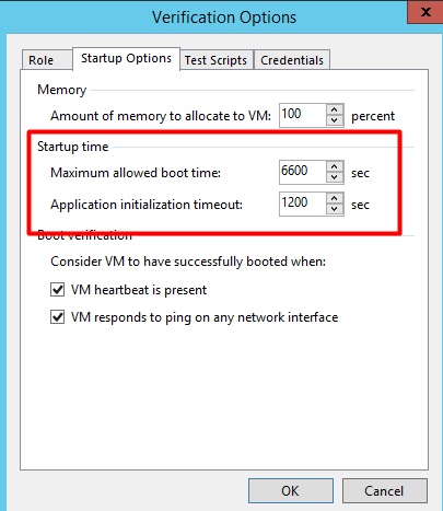 3- Sanal sunucunun test ortamında geç açılması Ağ ya da Depolama alanı kapasitelerinden kaynaklanabilir. Bu hemen aksiyon alabileceğiniz bi r konu değil. Bunun yerine SureBackup ayarlarından sanal sunucunun startup sürelerini uzatacağız.