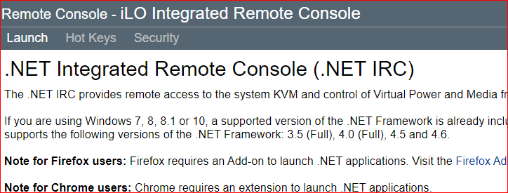Tarayıcıdan sunucunun ILO arayüzüne bağlanıp oturum açtığımda (ILO 4 için Explorer kullanadım) soldaki menüden Remote Console’a tıklıyorum. Burada .NET Integrated Remote Console (.NET IRC) için Launch butonuna basarak Remote Console ekran ile sunucuya erişiyorum.