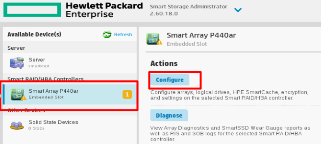 Yine ekranın solundan Smart Array P440ar yani RAID Controller’a tıklayalım ve Actions altından Configure diyelim.