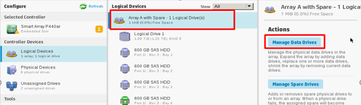 Genişletmek istediğimiz Array A üzerine tıkladıktan sonra Actions altından Manage Data Drives’e tıklayalım.