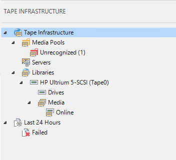 İşlem tamamlandığında Tape ünitenizin Veeam üzerine tanımlandığını göreceksiniz. Bu, tek kartuş rotasyonlu bir ünite olduğu için bir adet tanımlanmamış (Unrecognized) kaset bulunmakta.