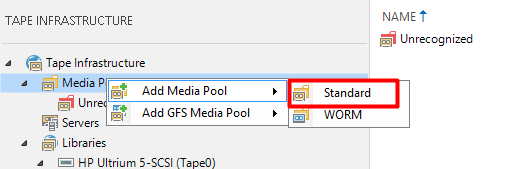 Biz standard bir saklama politikası uygulayacağımız için sırasıyla Media Pool ve Standard seçenekleri ile devam ediyoruz. Burada standard dışında WORM (Write Once Read Many) seçeneği de bulunmakta. WORM kasetlerde yalnızca bir kez veri yazabilir ardından aynı veriyi sonsuz kez okuyabilirsiniz. Bu kasetlerde herhangi bir saklama politikası bulunmadığı gibi üzerine yazılabilir kasetlerle aynı pool içerisinde de kullanamazsınız.