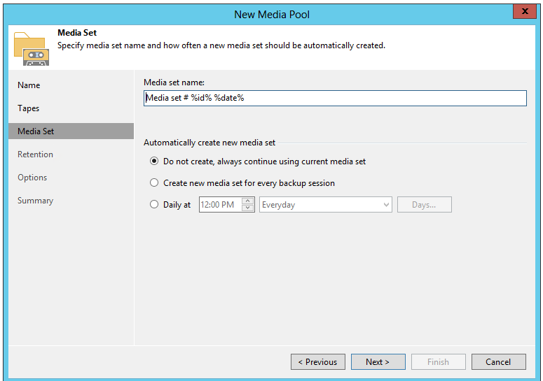 Media Set yedeklerinizi yazacağınız kasetlerden oluşan bir settir. Kapasiteleri daha verimli kullanmak adına sürekli devam eden bir media set önerilir. Ben zaten tek kaset kullanacağım için “Do not crete, always continue using current media set” seçeneği ile devam ediyorum.