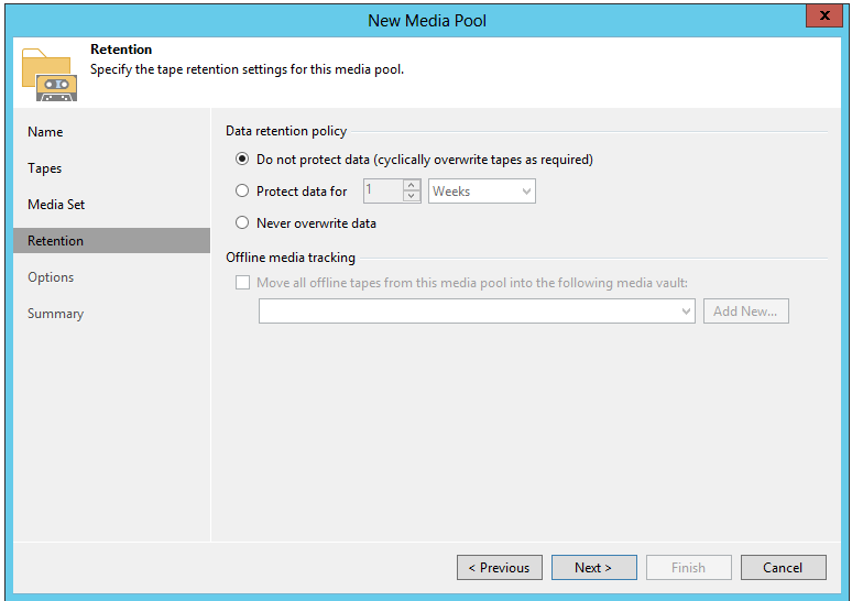 Rotasyon süresi sona erdiğinde bu kasetin üzerine tekrar veri yazacağım için “Do not protect data” seçeneğini işaretliyorum. Fakat daha gelişmiş ve karmaşık bir yapıda kasetlerinizdeki verilerin kontrolsüzce üzerine yazılmaması için bir retention politikası seçmenizde fayda olabilir.