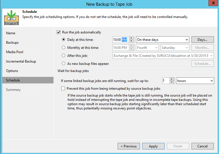 Son olarak bu Tape Job’ın ne zaman çalışması gerektiğini planlıyorum. Eğer tape backup job çalışma saati gelmiş ve hala birincil backup job sonlanmamışsa 3 saat kadar hata vermeden beklemesini belirtiyorum.