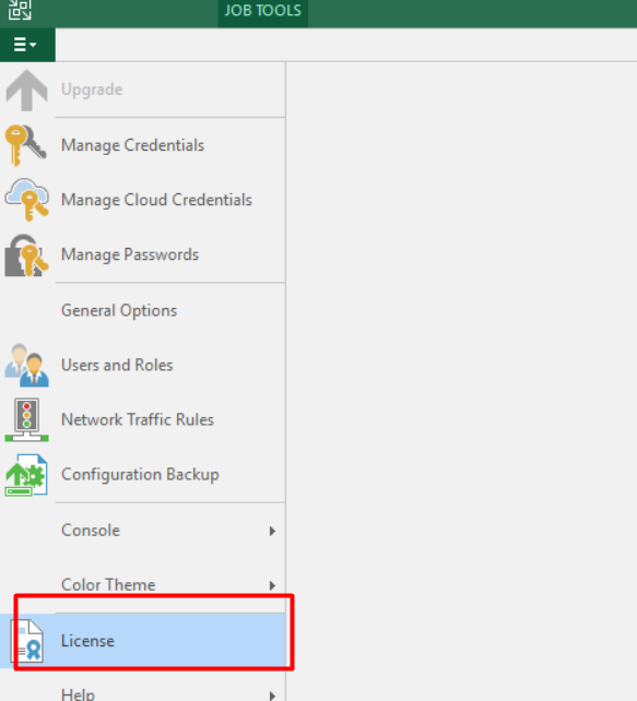 Veeam Backup & Replication programınızın lisans bilgilerini ve bu lisansın hangi sunucularda kullanıldığını görmek için sol üstteki menu çubuğuna tıklayın. Açılan menüden License seçeneğine tıklayın.