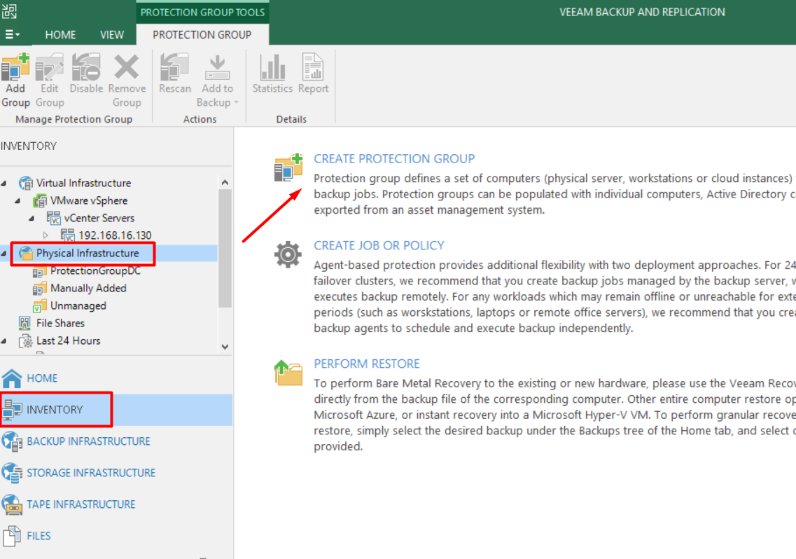 Protection Group oluşturmak için Inventory ana menüsü altında Physical Infrastructure seçeğine tıklayın. Burada Create Protection seçeneğini göreceksiniz.