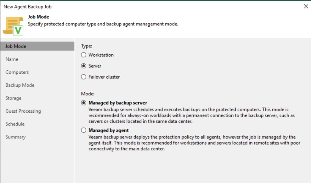Type olarak Server ve bu sunucunun yedekleme işlemini merkezi bir şekilde yöneteceğim için de Managed By backup server seçeneğini seçeceğim.