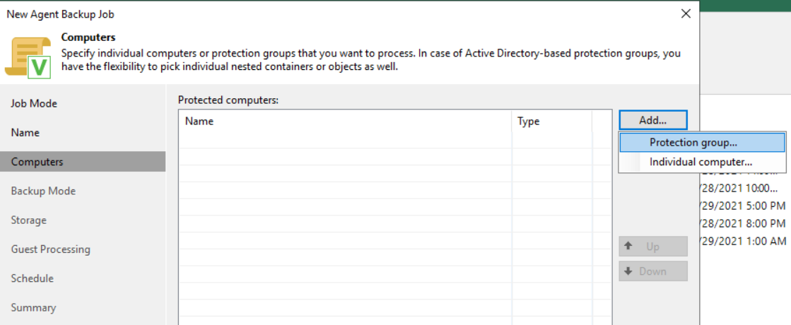 Add butonu ile oluşturduğum protection group’u seçip açılan pencereden ptorection group’a eklediğim sunucumu seçiyorum. Hali hazırda agent’I bulunan bir sunucuyu Indivudual computer seçeneği ile de ekleyebilirsiniz.