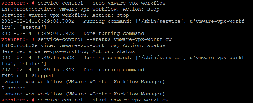 Çözüm için öncelikle Vcenter ip adresine ssh bağlantısı başlatalım ve root olarak login olup shell ekranına giriş yapalım. Sonrasında vmware-vpx-workflow servisini stop ve start komutları ile yeniden başlatalım.