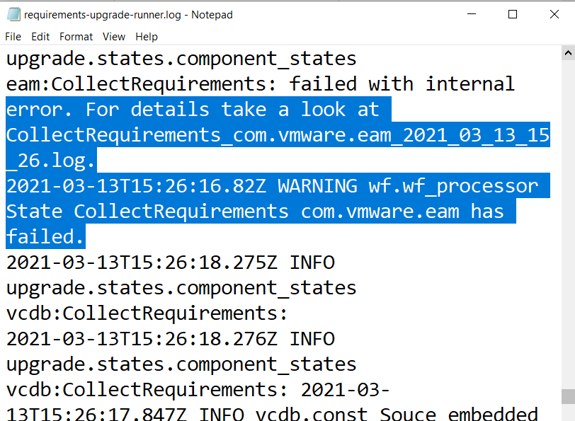 /var/log/vmware/upgrade/ dizini içerisinde eğer ruquirements-upgrade-runner.log dosyasını açtığınızda aşağıdaki görselde de işaretli vmware.eam has failed hatasını görüyorsanız problem, eam.properties dosyasının içeriğinin boş olmasından kaynaklanmaktadır. eam.properties dosyasının boş olması vmware-eam servisinin yani ESX Agent Manager servisinin doğru çalışmamasına sebep olmakta.