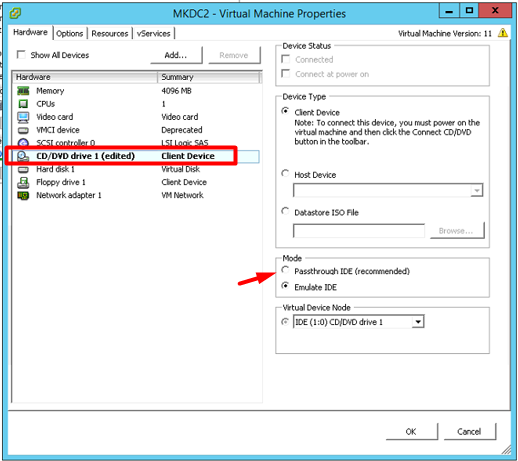 - Hardware menüsü altında CD/DVD drive donanımının Mode başlığı altında Passthrough IDE seçeneğini işaretleyin.