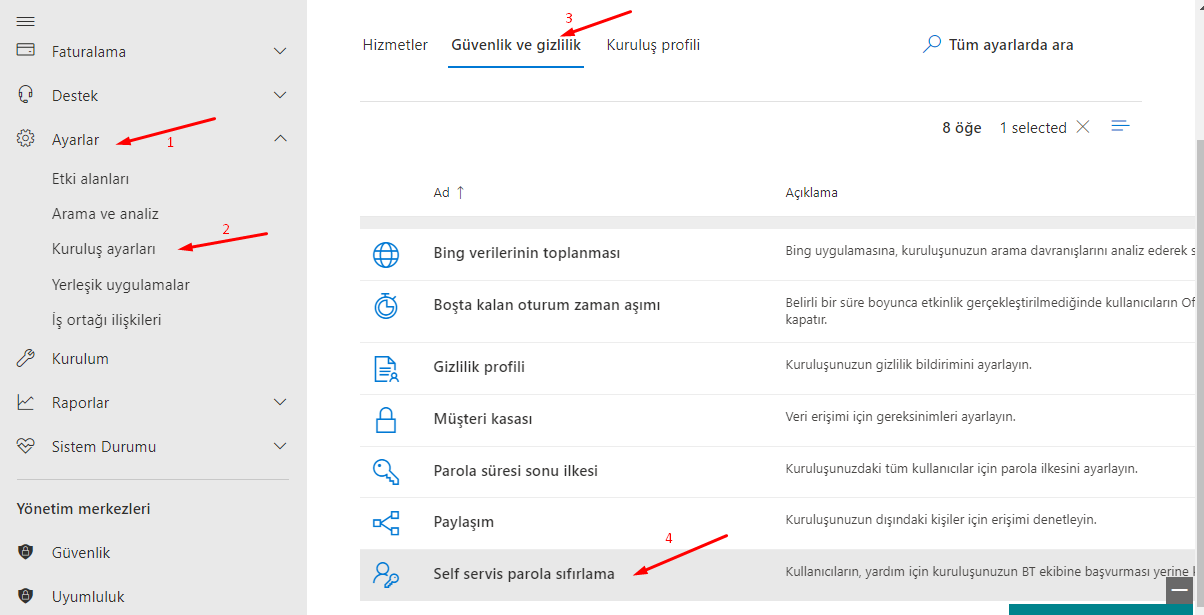 Yönetim panelinde Ayarlar>>Kuruluş Ayarları>>Güvenlik ve Gizlilik>>Self Service parola sıfırlama menülerini takip edin. Burada sizi Azure Active Directory’deki ilgili alana yönlendirecek bir link göreceksiniz.