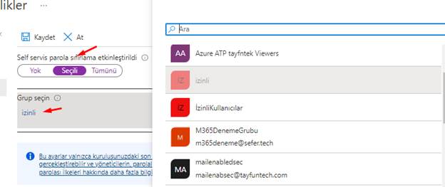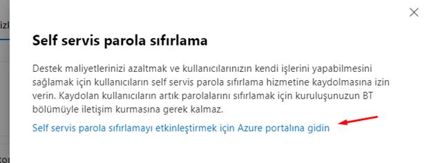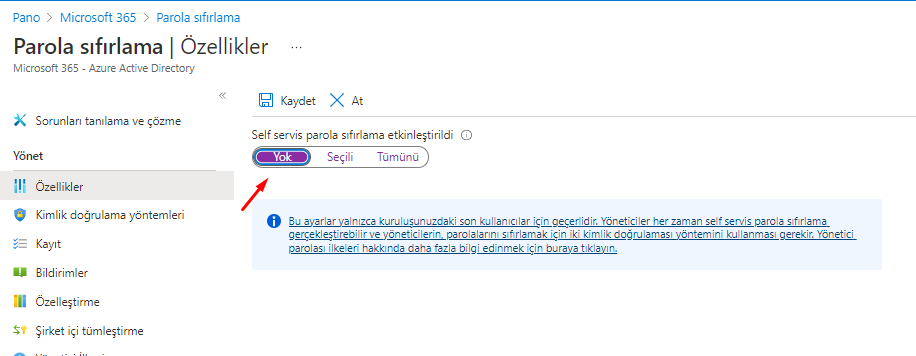 Burada bakmanız gereken yer SSPR yani Self Servis Parola Sıfırlama özelliğinin aktif olup olmadığı.