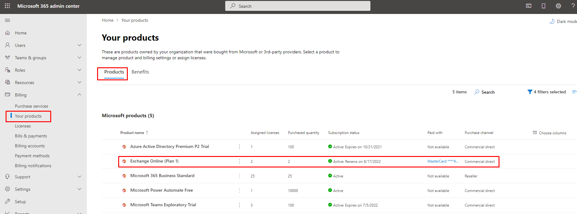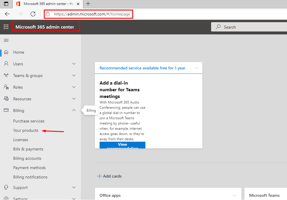 Öncelikle admin.microsoft.com adresine giriş yapın. Ardından ekranın solunda görünen Show all seçeneği ile menüyü genişlettikten sonra Billing başlığına tıklayın. Billing başlığı altında Your Products seçeneğine giriş yapın.