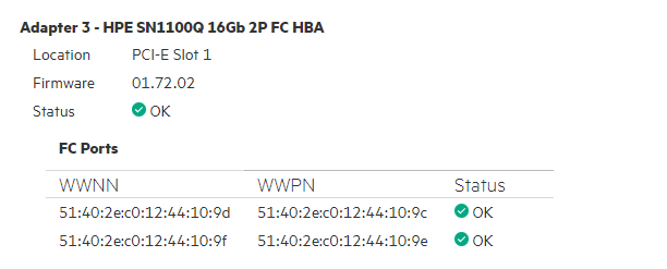Burada listelenen wwn id’lerin sunucu ve storage tarafında hangi portlara ait olduğunu öğrenmek için sunucuların ve storage’ın arayüzlerine bağlanıp network kartlarını kontrol etmek gerekir. Aşağıdaki örnekte bir sunucunun ILO arayüzünden HBA Kartının hangi slot üzerinde olduğu ve hangi portlara sahip olduğu görünmekte.