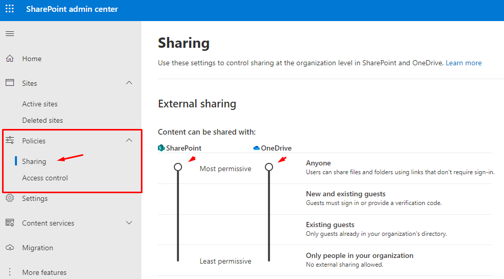 Açılan pencerede Policies>Sharing menülerine tıklayın. External Sharing başlığı altında Sharepoint ve OneDrive için içeriklerin paylaşım seviyeleri bulunmakta. Burada bulunan butonlar varsayılan olarak Any yani herkese açık izin seviyesinde gelmektedir. Butonları aşağı çekerek paylaşım seviyesini organizasyon içine doğru daraltabilirsiniz.