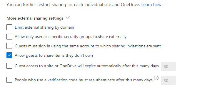 Ayrıca More external sharing settings başlığını genişletirseniz dış kullanıcılar ile dosya paylaşımı ensasında uygulayabileceğiniz ekstra kuralları görebilirsiniz.