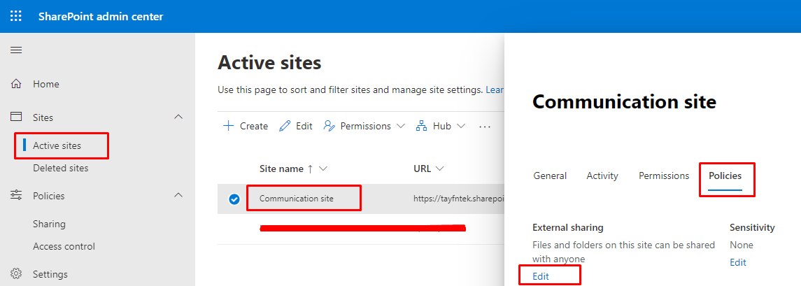 SharePoint yönetim merkezinde Active sites altında işlem yapacağımız Site’ı seçelim. Açılan pencerede Policies başlığı altında External sharing seçeneğini göreceksiniz.