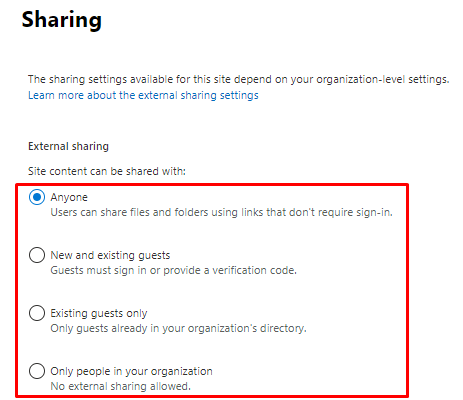 Edit butonuna tıkladıktan sonra Sharing menüsü açılacaktır. Biraz yukarıda açıkladığımız paylaşım seviyeleri burada da karşımıza çıkıyor. External sharing başlığı altında site içeriğinizin paylaşım seviyesini ayarlayabilirsiniz.