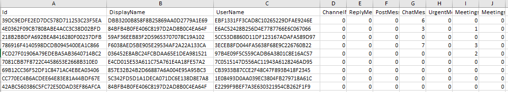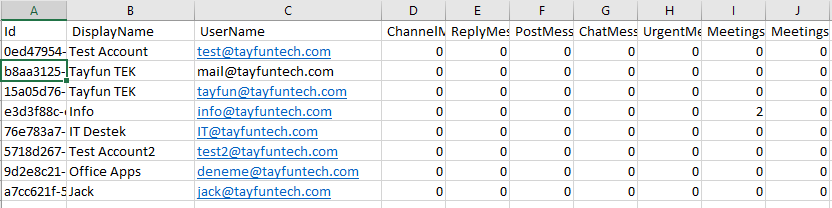 Özellikle Teams olmak üzere Microsoft 365 üzerinde oluşturduğumuz raporlarda aşağıda görebileceğiniz gibi kullanıcı adı yerine farklı ID’ler yer almakta. Bu sorun Microsoft 365 üzerindeki bir özelliğin aktif olmasından kaynaklanmaktadır.