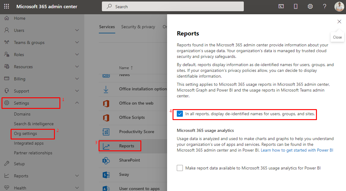 Microsoft 365 admin center üzerinde Settings>Org Settings>Reports> menülerini takip ederek In all reports, display de-identified names for users, groups, and sites seçeneğinin başındaki işareti kaldırmalısınız.