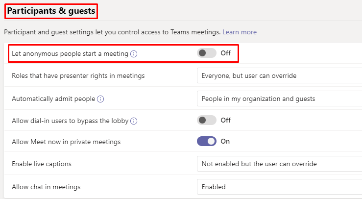 Participants & guests başlığı altında varsayılan olarak kapalı durumda gelen “Let anonymous people start a meeting” özelliğini aktif edelim.