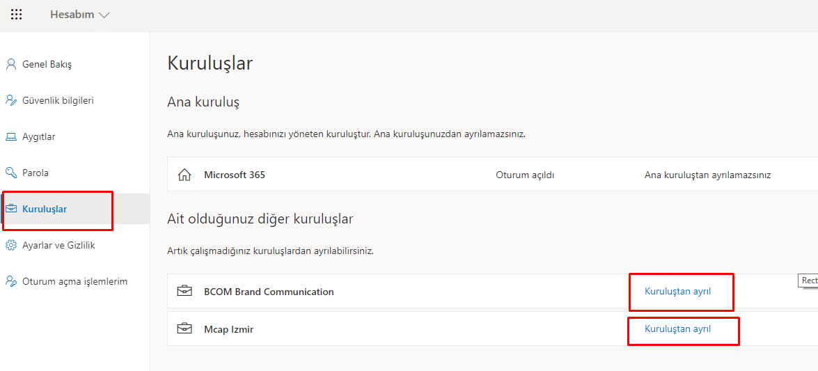 Bu menüde artık konuk olarak hesabını kullanmak istemediğiniz kuruluşun yanında bulunan “Kuruluştan Ayrıl” butonuna tıklayabilirsiniz.