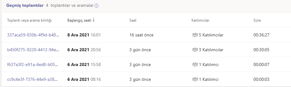 Ekranı biraz aşağı kaydırdığınızda Geçmiş toplantılar başlığını göreceksiniz.