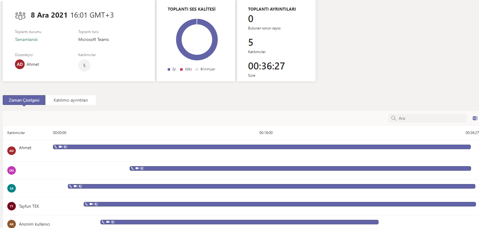 Herhangi bir toplantının ID’sine tıkladığınızda aşağıdaki gibi bir özet ile karşılaşacaksınız. Teams, toplantı özet bilgilerinin yanında hangi kullanıcı saat kaçta toplantıya giriş yapmış ve ne kadar toplantıda kalmış gibi soruları ilk izlenimde size sunuyor.