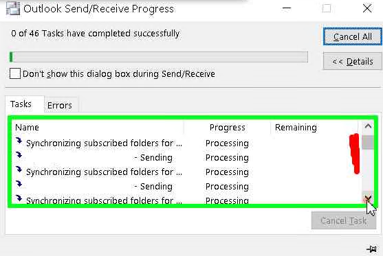 Burada kontrol edilmesi gereken bir çok yön olabilir fakat sorun genel olarak Outlook’un Gmail sunucularından çekmeye çalıştığı abone olunmuş klasörler veya alt klasörlerdir. Gönder al işleminiz çok uzun sürüyorsa ve detaylarda aşağıdaki gibi “Synchronizing subscribed folders” yani abone olunan klasörlerin güncellemeleri yer alıyorsa aynı sorundan bahsediyoruz demektir.