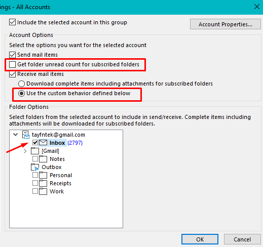 Get folder unread count for subscribed folders seçeneğinin başındaki kutucuk işaretli ise bu işareti kaldırın. Ayrıca diğer klasörleri devre dışı bırakı sadece gelen kutusunun güncellenmesi için Use the custom behavior defined below seçeneğini işaretleyin ve hemen altında gelen kutunuzu seçin. Bu şekilde kaydederek çıkış yapabilirsiniz. Outlook’u kapatıp açtığınızda gönder/al yaparken artık abone olunan klasörleri güncellemeye çalışmadığını göreceksiniz.