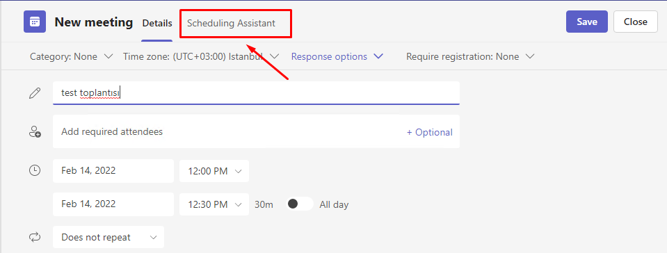 Teams üzerinde Takvim bölümünde Yeni bir toplantı oluştururken Scheduling Assistant seçeneğine tıklayın.