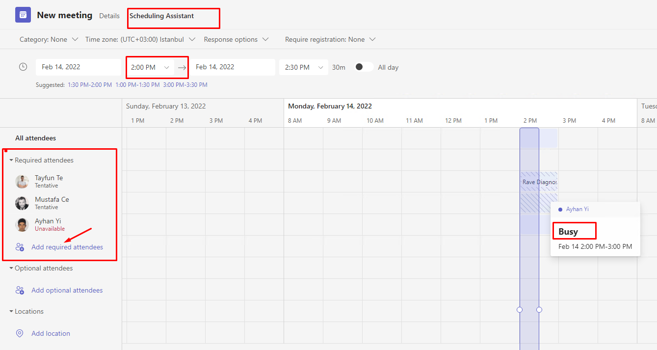 Aşağıda görebileceğiniz üzere Saat 2’ye planladığım toplantı için ekranın solunda eklediğim katılımcıların müsaitlik durumunu görebiliyorum. Eğer katılımcının bir aktivitesi bu toplantı ile çakışıyorsa müsait olmadığına dair bir ibare görebiliyorum. Ek olarak ekranın ortasında beliren takvim üzerinde katılımcının diğer saat aralıkları için de mevcut planlanmış aktivitelerini görebiliyorum.