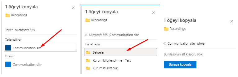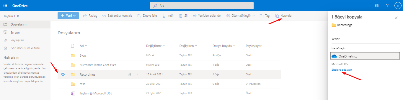 Ekranın sağında kopyalamak istediğiniz alanlar gösterilecektir. Sitelere göz at seçeneğine tıkladıktan sonra SharePoint üzerindeki son ziyaret ettiğiniz veya takip ettiğiniz siteleri görebilirsiniz. İstediğiniz siteyi seçtikten sonra o site içerisindeki klasör dizinini belirtebilir ve kopyalama işlemini başlatabilirsiniz.