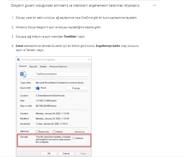Microsoft’un dökümanında kaynağını bildiğiniz ve çalıştırmak istediğiniz makro içeren dosyalar için bu durumu aşağıdaki gibi aşabileceğiniz belirtilmekte. Fakat ne zaman bu uyarı ile başınız belaya girse emin olun aşağıda belirtilen seçenek (unblock) orada olmuyor.