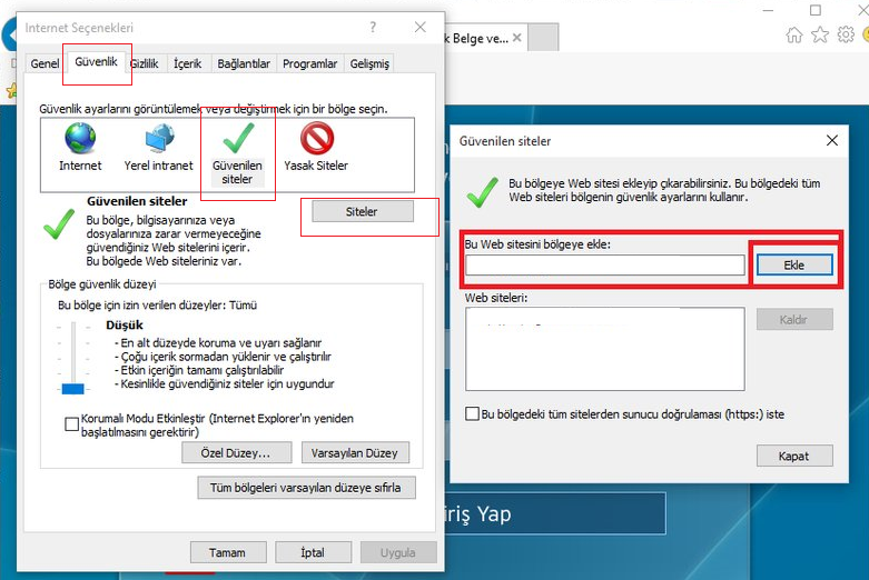 1- Denetim masası>>Internet Ayarları>>Güvenlik>>Güvenilen Siteler>>Siteler menüsüne gidip Güvenilen Siteler arasına ortak alan dosya yolunu ekleyeceğiz. Örn: 192.168.1.50