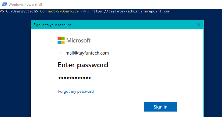Connect-SPOService -Url https://tayfntek-admin.sharepoint.com