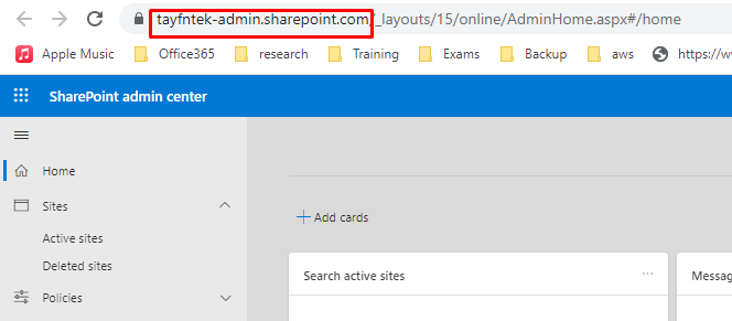 Note: You can obtain the URL we used in the above command by copying it from the address bar of the browser when you enter the SharePoint Admin Center.