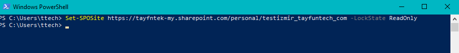 Set-SPOSite https://tayfntek-my.sharepoint.com/personal/testizmir_tayfuntech_com -LockState ReadOnly