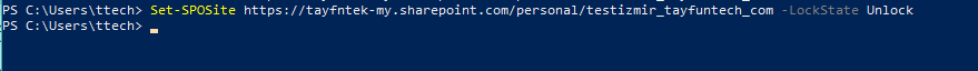 Set-SPOSite https://tayfntek-my.sharepoint.com/personal/testizmir_tayfuntech_com -LockState Unlock