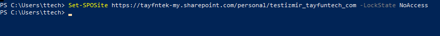 Set-SPOSite https://tayfntek-my.sharepoint.com/personal/testizmir_tayfuntech_com -LockState NoAccess