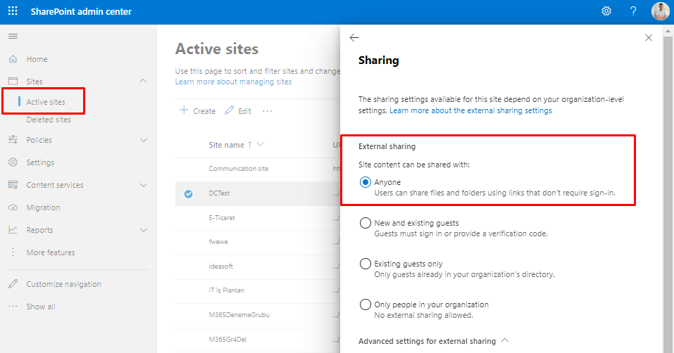 Ardından Active sites başlığından ilgili sitenin Sharing ayarlarını kontrol ettik ve External Sharing, Anyone olarak ayarlanmıştı. Burada da sorun yok.