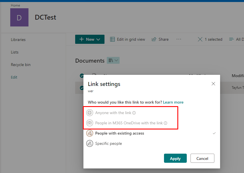 Bu özelliği kapattıktan sonra Document Center içerisindeki dosyaları paylaşmak istediğimizde Anyone with the link özelliğinin aktif olduğunu gördük.