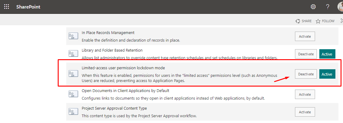 Biraz daha incelediğimizde oluşturulan diğer sitelerin (Teams, Communication) dış kullanıcılar ile dosya paylaşabildiğini gördük. Dış kullanıcılar ile dosya paylaşımı yapılamayan siteler ise Document Center olarak oluşturulmuştu. Document Center ayarlarını kontrol ettiğimizdeyse Anonymous kullanıcılar gibi limitli erişime sahip kullanıcıların erişimini tamamen engelleyen Limited-Access user permission lockdown mode özelliğinin varsayılan olarak aktif geldiğini gözlemledik.