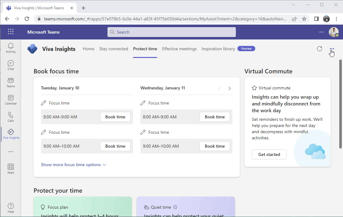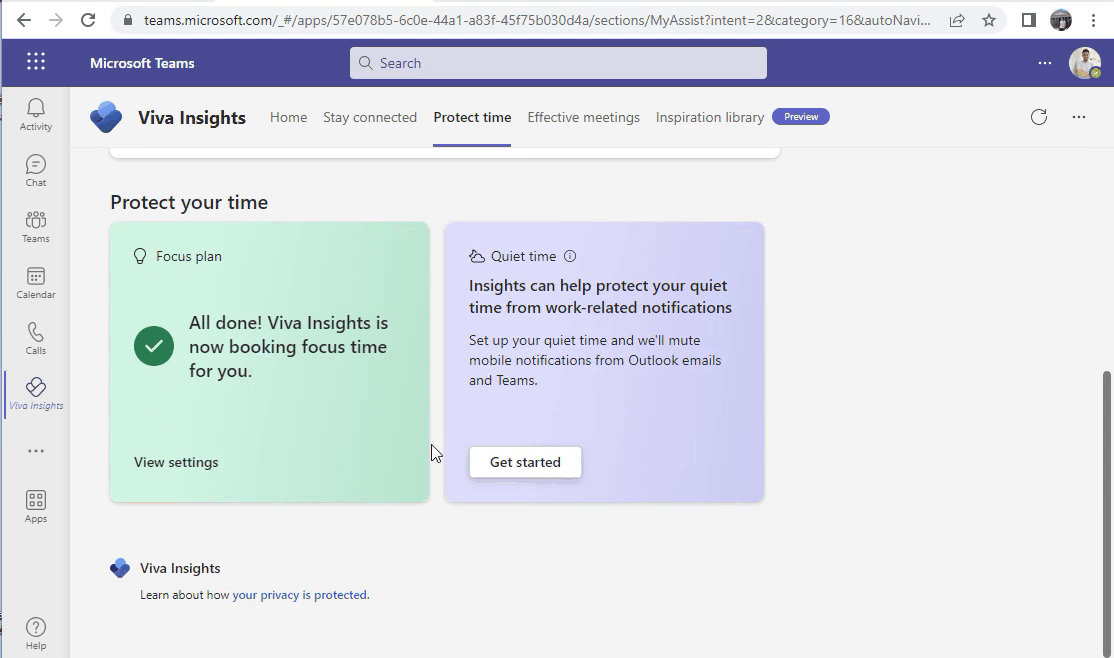Aslında söylenenler dikkate alınınca rastgele bir problem olmayacak kadar tutarlı bir konu ortaya çıkıyor. Zaten Teams durumlarında kullanıcının seçebileceği focusing diye bir ibare yok. Dolayısıyla bu ibare ancak farklı bir servis tarafından tetiklenmiş oabilir. Odaklanma dediğimizde de aklımıza direkt olarak Viva geldiği için hemen Teams üzerinden Viva uygulamasına geçip Protect Time başlığını kontrol ettim.