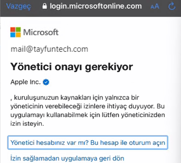 Apple inc. Kuruluşunuzun kaynakları için yalnızca bir yöneticinin verebileceği izinlere ihtiyaç duyuyor. Bu uygulamayı kullanabilmek için lütfen yöneticinizden izin isteyin.