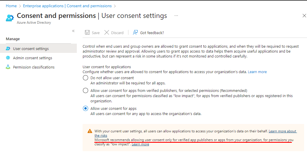 Eğer bu seçenek “Do not allow user consent” olarak işaretliyse, yukarıdaki hatayı almanız gayet normal. Eğer bu seçeneği “Allow user consent for apps” olarak işaretlerseniz, sadece Apple değil 3rd party tüm uygulamalar için inisiyatifi kullanıcılara teslim etmiş olursunuz. Microsoft, sadece güvenilen firmaların yazılımları ve sizin Azure AD’ye kayıt ettiğiniz yazılımlara izin vermenizi öneriyor. Bu nedenle ikinci sıradaki “Allow user consent for apps from verified publishers…” seçeneği ile devam etmeye, sanırım orta yolu bulmak olarak da bakabiliriz.